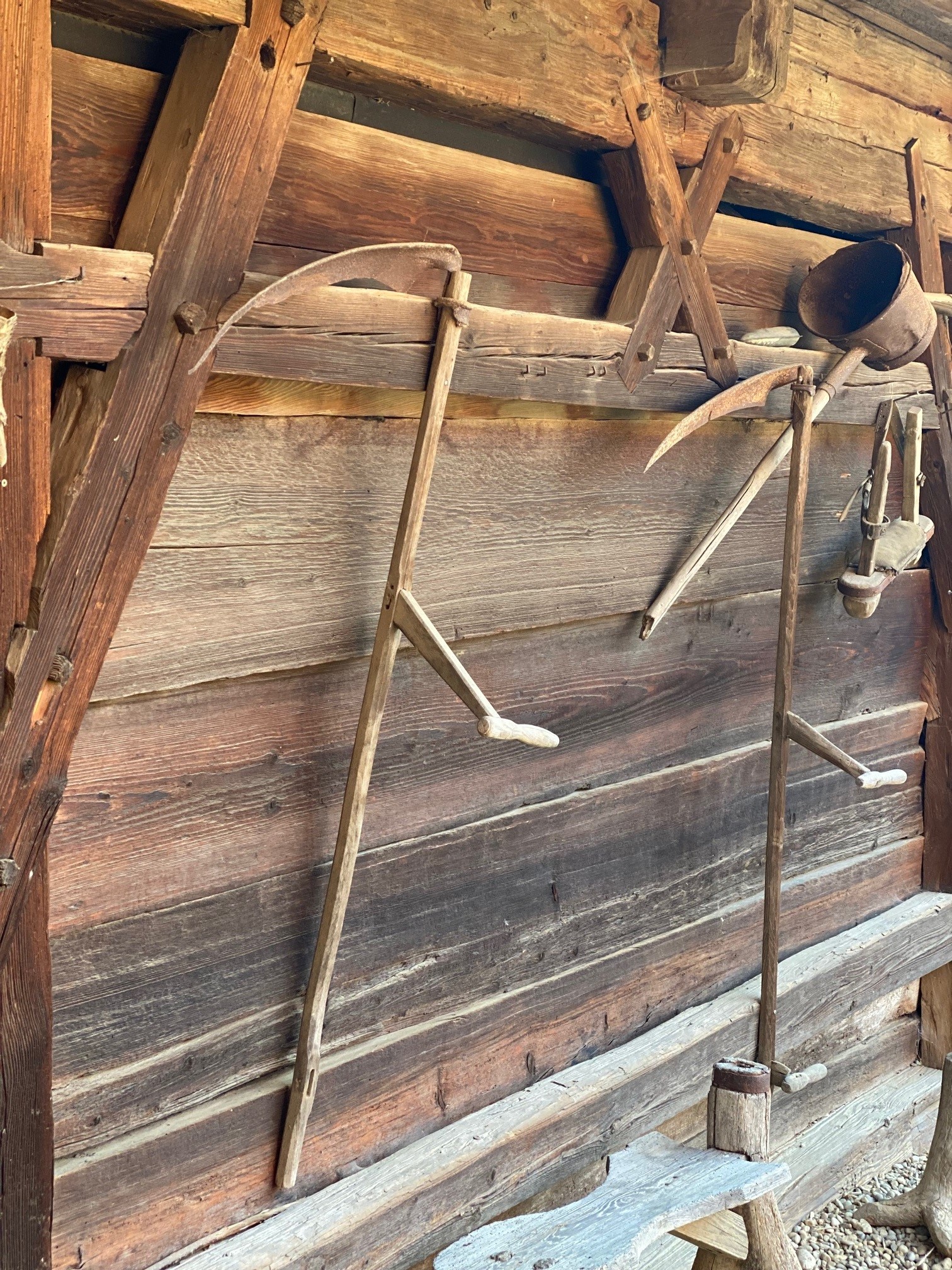 eine Sense, ein Wetzstein, ein Dengelstock (wenn vorhanden)