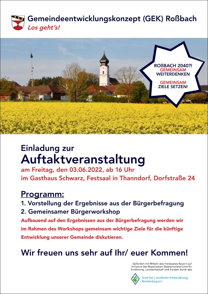 Die Gemeinde Roßbach lädt herzlichst ein zur Auftaktveranstaltung "Gemeindeentwicklungskonzept (GEK) für die Gemeinde Roßbach" am Freitag, den 3. Juni ab 16 Uhr im Gasthaus Schwarz in Thanndorf.