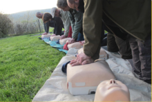 Praktisches Üben in realistischen Szenarien: z. B. stabile Seitenlage in Hanglage, Wiederbelebung, Versorgung von Brand- und Schnittwunden u. v. m.