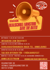 Die RS Arnstorf lädt alle Interessierten herzlich zum Tag der offen Tür + Frühjahrsfest ein.