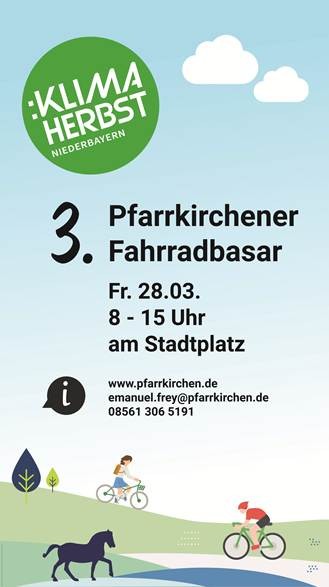 Auch in diesem Jahr findet der Pfarrkirchener Fahrradbasar am Stadtplatz nebst dem Wochenmarkt statt. Eingeladen sind alle Interessierten, sich Fahrräder und -zubehör anzuschauen, zu testen und zu kaufen oder zu verkaufen.