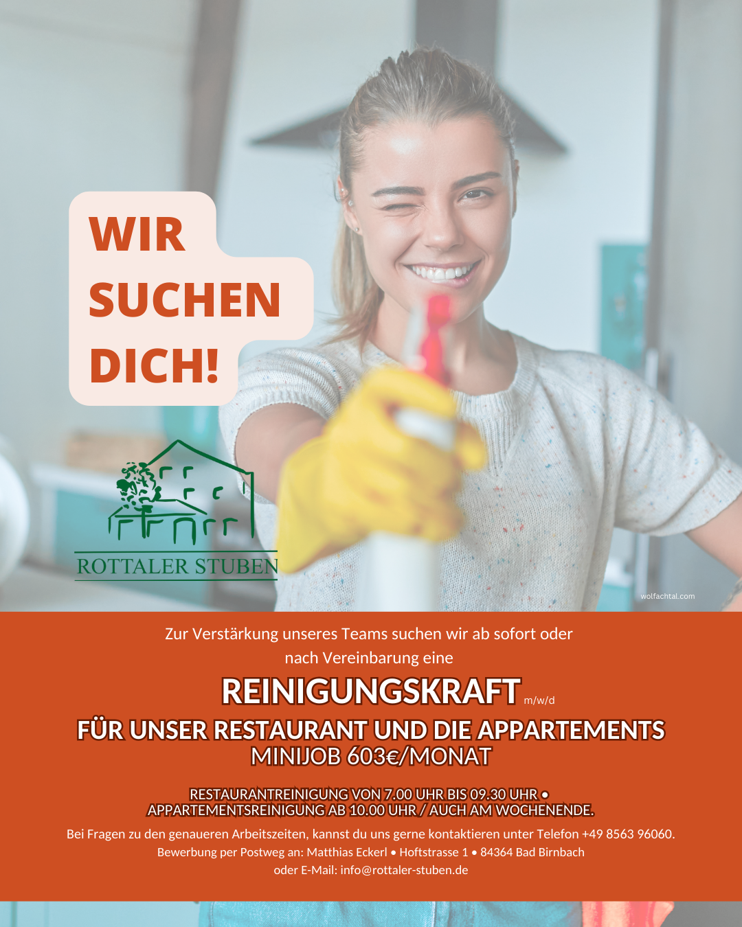 Sauberkeit ist Ihre Stärke? Werden Sie Reinigungskraft (m/w/d) für Restaurant und Appartements – Minijob.