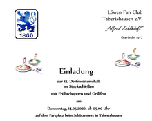 Wir laden wieder herzlich zur 12. Dorfmeisterschaft im Stockschießen beim Schützenwirt in Tabertshausen ein. Jedermann ist gern gesehen, für das leibliche Wohl ist wieder bestens gesorgt.