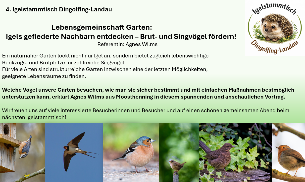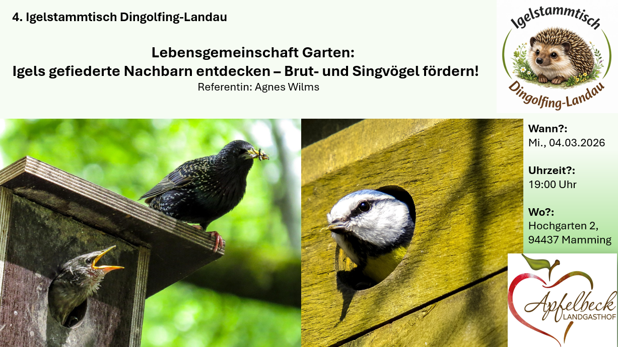 4. Igelstammtisch Dingolfing-Landau - Lebensgemeinschaft Garten: Igels gefiederte Nachbarn entdecken – Brut- und Singvögel fördern!