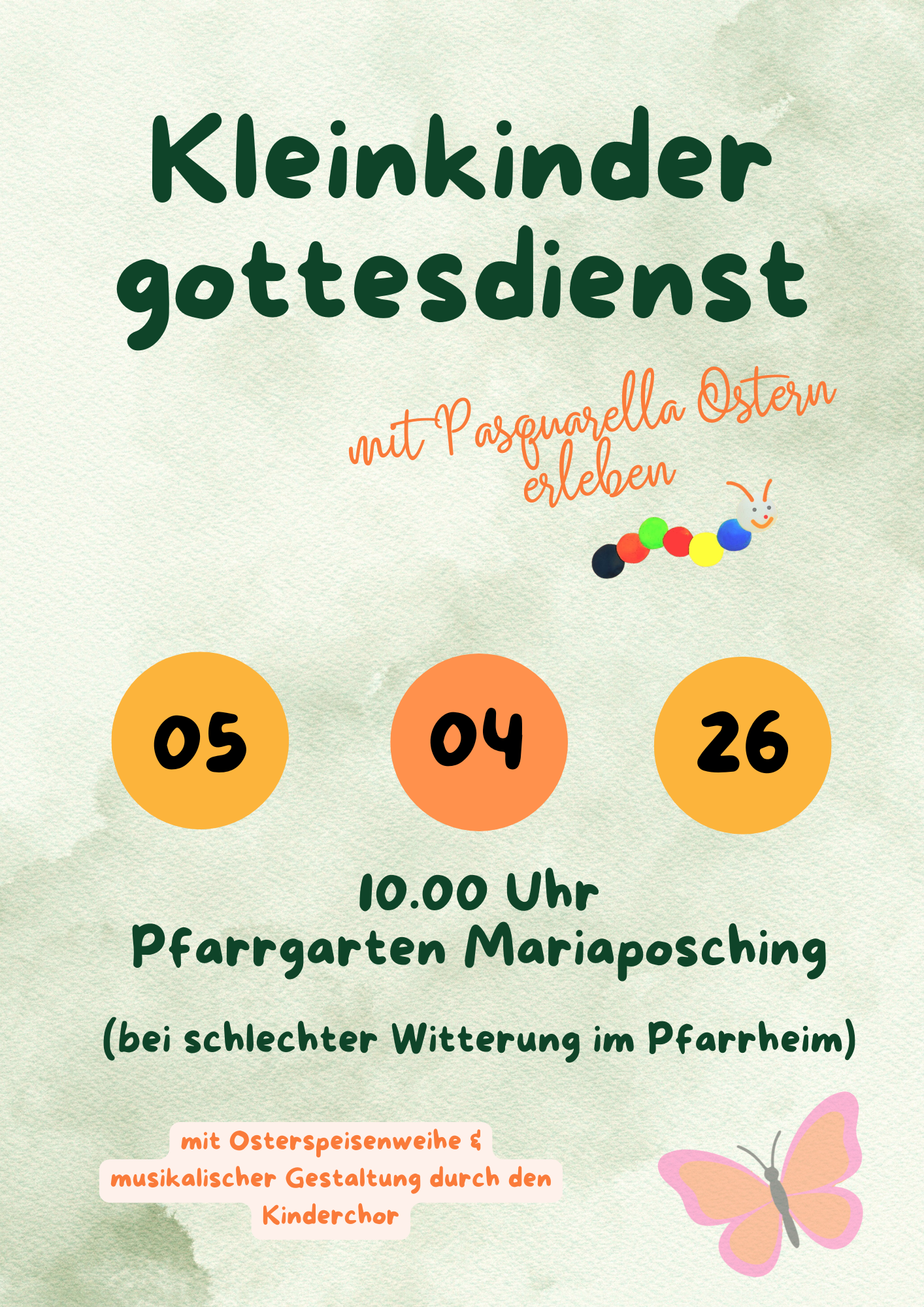 Herzliche Einladung an alle Kinder bis zur 2. Klasse zum Kleinkindergottesdienst am Ostersonntag, 05. April um 10.00 Uhr im Pfarrgarten in Mariaposching. Bei schlechter Witterung findet der Gottesdienst im Pfarrheim statt. Zum Gottesdienst bitte die fertigen Pasquarellas mitbringen, wer beim Gottesdienst am 22. Februar mit dabei war.