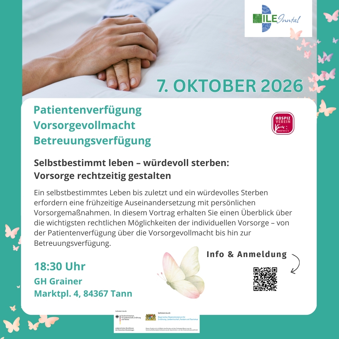 Ein selbstbestimmtes Leben bis zuletzt und ein würdevolles Sterben erfordern eine frühzeitige Auseinandersetzung mit persönlichen Vorsorgemaßnahmen. In diesem Vortrag erhalten Sie einen Überblick über die wichtigsten rechtlichen Möglichkeiten der individuellen Vorsorge – von der Patientenverfügung über die Vorsorgevollmacht bis hin zur Betreuungsverfügung.