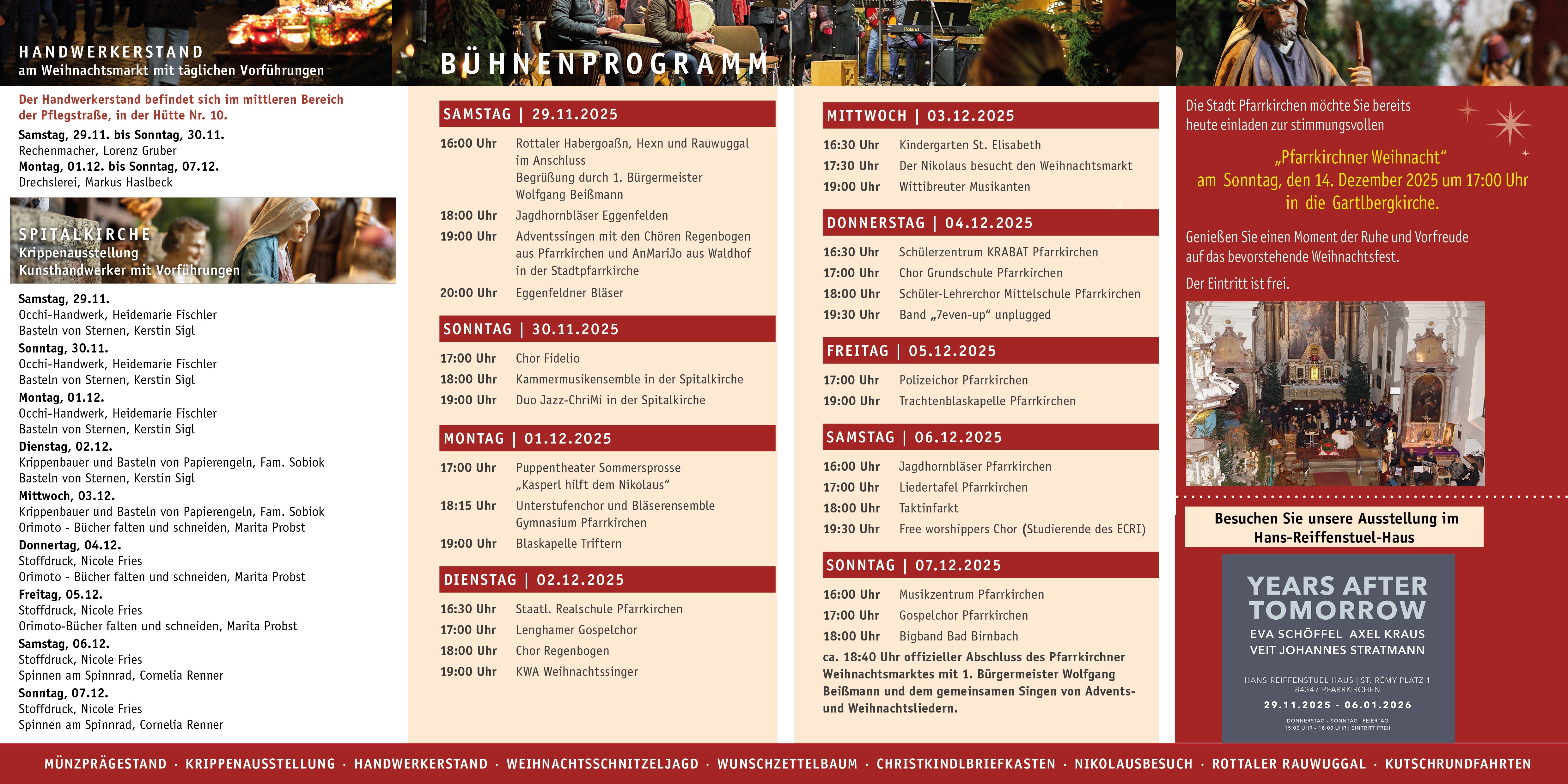 Hier können Sie sich nach Weihnachtsgeschenken umsehen, Handwerkern bei ihren kunstvollen Arbeiten über die Schulter schauen, das Bühnenprogramm mit einheimischen Künstlerinnen und Künstlern genießen sowie stimmungsvolle Ausstellungen besuchen.