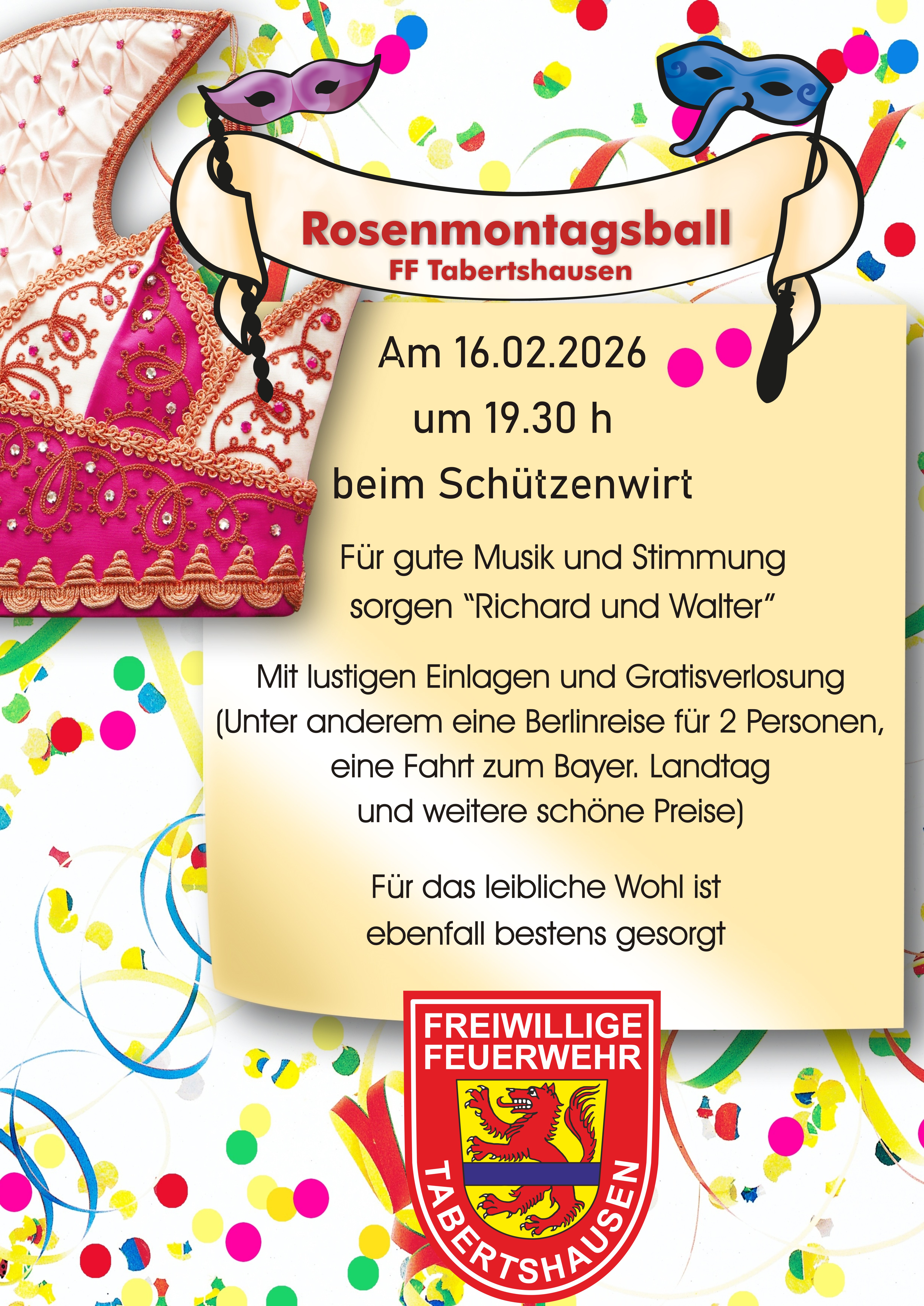 Herzliche Einladung zum Rosenmontagsball der FF Tabertshausen beim Schützenwirt.