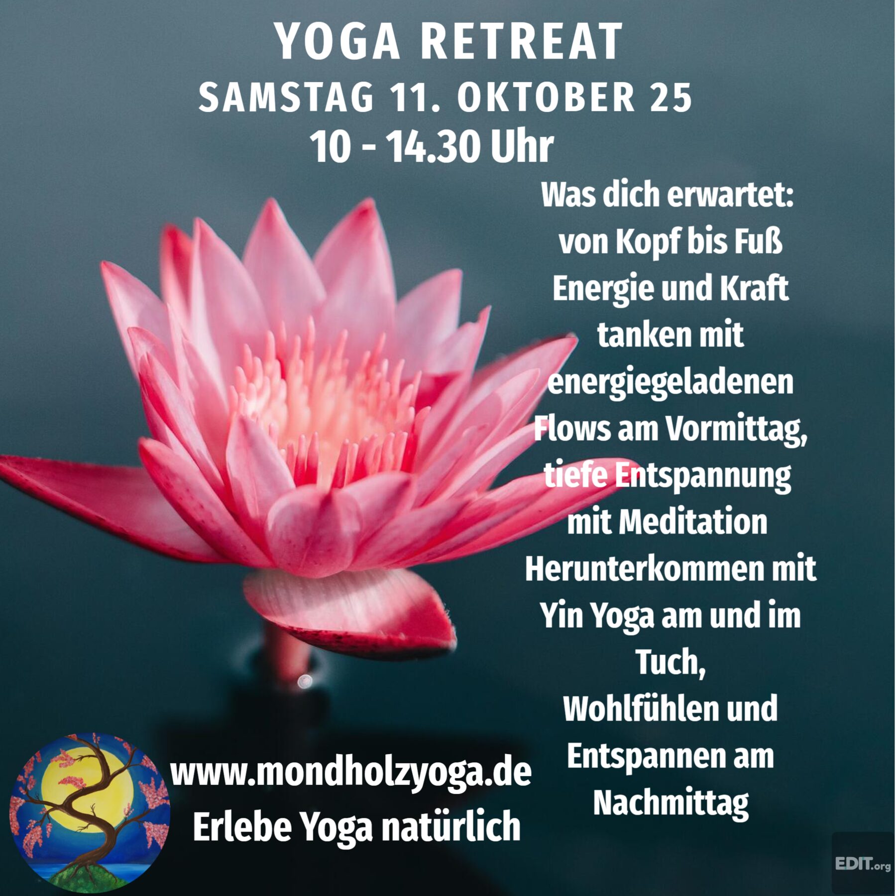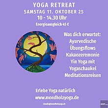 Das nächste Yoga Retreat im Mond-Yoga Raum steht fest. Am Samstag, 11. Oktober um 10 Uhr kannst du dem täglichen Trott entfliehen und die Hektik einmal hinter dich lassen. Von Kopf bis Fuß selbst in dich investieren. Ein energiegeladener Flow am Vormittag auf der Matte, Hatha Yoga am Yogatuch, Meditationen. Nach einer Pause gehen wir es ruhiger an mit Yin Yoga im und am Tuch. Wir runden unseren gemeinsamen Tag mit Meditation und Atempausen ab. Was dich noch erwartet kann sich sehen lassen.