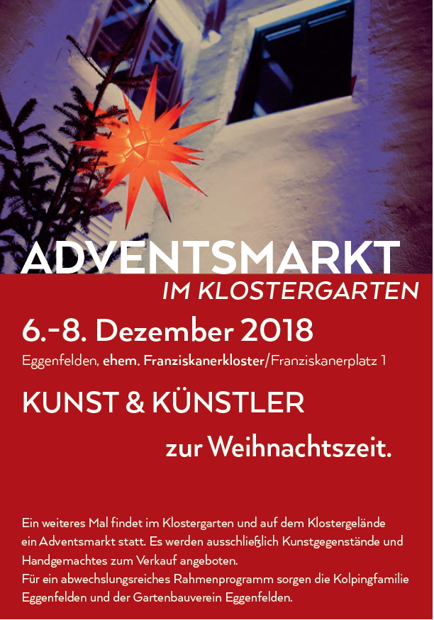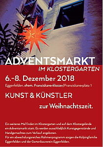 Ein weiteres Mal findet im Klostergarten und auf dem Klostergelände ein Adventsmarkt statt. Es werden ausschließlich Kunstgegenstände und Handgemachtes zum Verkauf angeboten. Für ein abwechslungsreiches Rahmenprogramm sorgen die Kolpingfamilie Eggenfelden und der Gartenbauverein Eggenfelden.