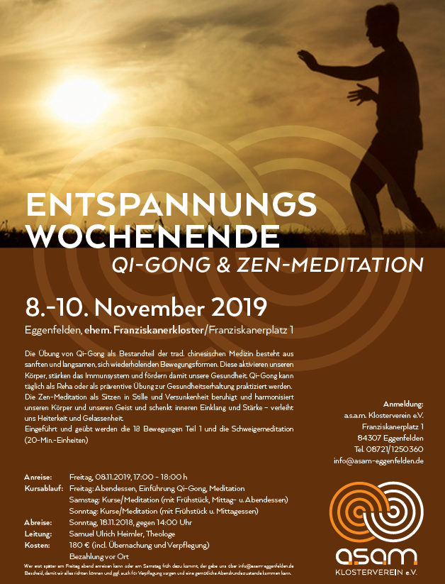 Die Übung von Qi-Gong als wiederholende fließende Bewegungsform und der Zen- Meditation als Sitzen in Versunkenheit beruhigt und harmonisiert unseren Körper und unseren Geist. Stille und Bewegung bringen unser Leben in Einklang und stärken unser Immunsystem, die Selbstheilungskräfte des Körpers wie des Geistes, wecken unser Selbstbewusstsein, schenken uns inneren Raum für Kreativität und Vitalität und verleihen innere Gelassenheit und Heiterkeit.