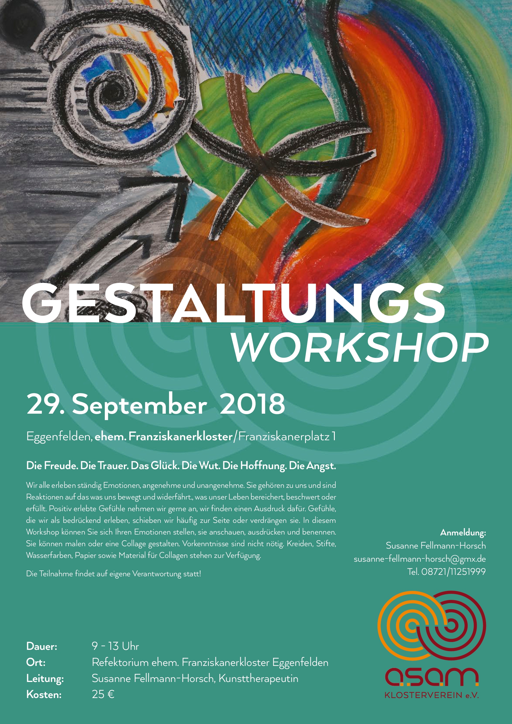 Wir alle erleben ständig Emotionen, angenehme und unangenehme. Sie gehören zu uns und sind Reaktionen auf das was uns bewegt und widerfährt, was unser Leben bereichert, beschwert oder erfüllt. Positiv erlebte Gefühle nehmen wir gerne an, wir finden einen Ausdruck dafür. Gefühle, die wir als bedrückend erleben, schwieben wir häufig zur Seite oder verdrängen sie. In diesem Workshop können Sie sich Ihren Emotionen stellen, sie anschauen, ausdrücken und benennen. Sie können malen oder eine Collage gestalten. Vorkenntnisse sind nicht nötig. Kreiden, Stifte, Wasserfarben, Papier sowie Material für Collagen stehen zur Verfügung.