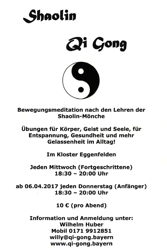 Anmeldung bei Willy Huber, Tel. 0171 / 9912851 oder willy@qi-gong.bayern