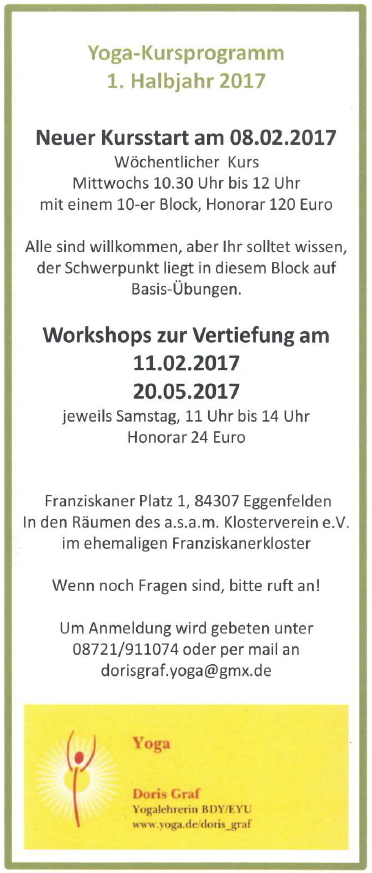 Ich freue mich auf Euer Kommen und bitte um Anmeldung unter 08721 / 91 10 74 oder per eMail an dorisgraf.yoga@gmx.de.