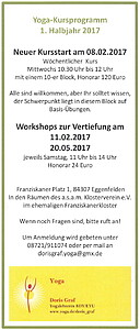 es ist soweit, ich kann euch ein paar neue Kurse anbieten. Wir starten am Mittwoch, den 8.2.2017 von 10.30 Uhr bis 12 Uhr mit einem wöchentlichen Kurs (10er Block, Honorar 120,-- Euro). Alle sind herzlich willkommen, der Schwerpunkt liegt in diesem Kurs auf Basis-Übungen.