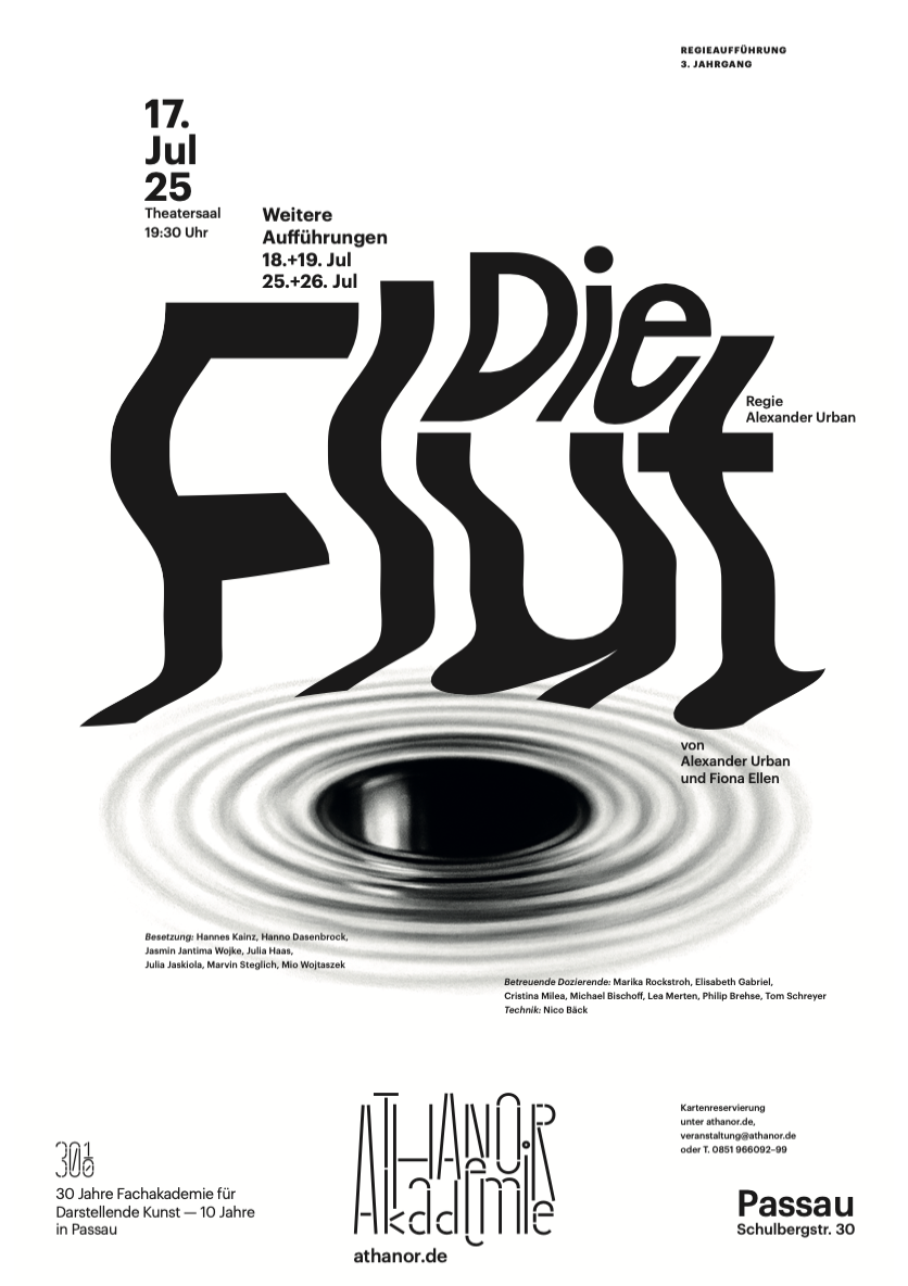 „Die Flut“ entfaltet ein dystopisches Szenario, das auf verstörend leise Weise das Verschwinden des Kollektiven verhandelt. In seiner Inszenierung zwischen Sprechtheater und multimedialer Installation verwandelt Alexander Urban den Bühnenraum in eine fragmentierte Welt aus Stoffen, Projektionen und hypnotischen Sounds. Erinnerungen tauchen auf, verzerren sich, lösen sich auf. Sieben Darsteller:innen des 3. Schauspieljahrgangs verbinden sich choreographisch zur Gruppe, vereinzeln sprechend zu Charakteren, verschwinden als Körper im Raum. Die Gemeinschaft wird zum Trugbild und zurück bleibt die Frage nach Verantwortung.