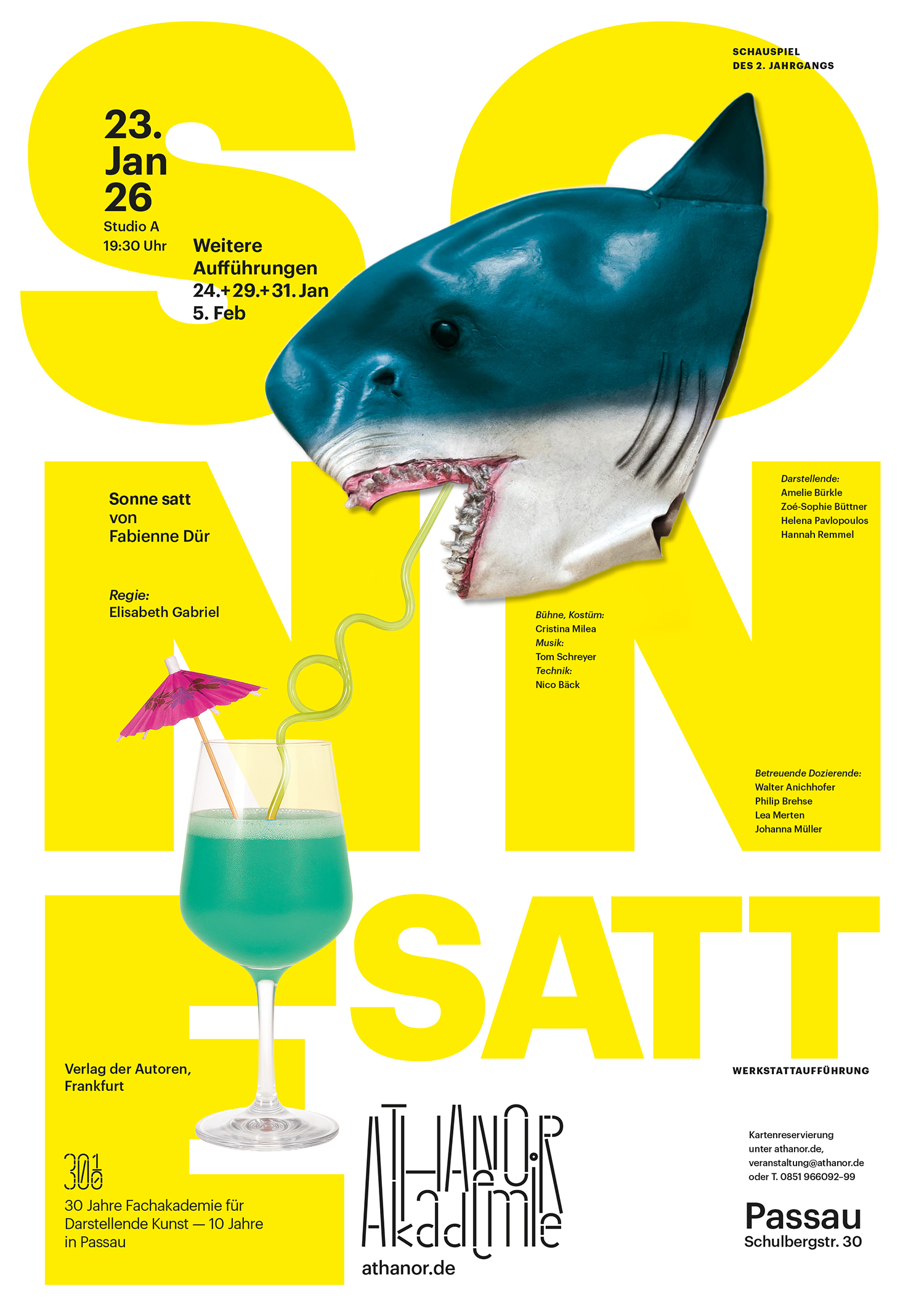 Statt klassischer Familienplattitüden eröffnet Fabienne Dür in „Sonne satt“ einen lebendigen Kosmos, der weit in die Vergangenheit reicht. Sie nimmt dabei nicht nur die Grauzone von Übergriffen unter die Lupe, sondern durchleuchtet so präzise wie tragikomisch die Missverständnisse und Kränkungen, die hinter der heilen Fassade von Liebe und Familie lauern. Virtuos springen die vier Schauspielstudierenden des 2. Jahrgangs zwischen Orts- und Zeitebenen. Mit großer Spielfreude und psychologischem Tiefgang stellen sie dabei eine Vielzahl von Fragen nach Wahrheit, Schuld und Verantwortung.