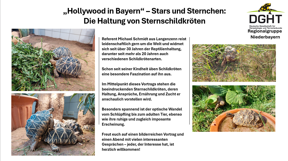 Im Mittelpunkt dieses Vortrags stehen die beeindruckenden Sternschildkröten. Anschaulich stellt er ihre Haltung, Ansprüche, Ernährung sowie Zucht vor.
