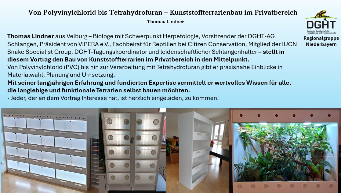 Thomas Lindner aus Velburg – Biologe mit Schwerpunkt Herpetologie, Vorsitzender der DGHT-AG Schlangen, Präsident von VIPERA e.V., Fachbeirat für Reptilien bei Citizen Conservation, Mitglied der IUCN Snake Specialist Group, DGHT-Tagungskoordinator und leidenschaftlicher Schlangenhalter – stellt in diesem Vortrag den Bau von Kunststoffterrarien im Privatbereich in den Mittelpunkt.