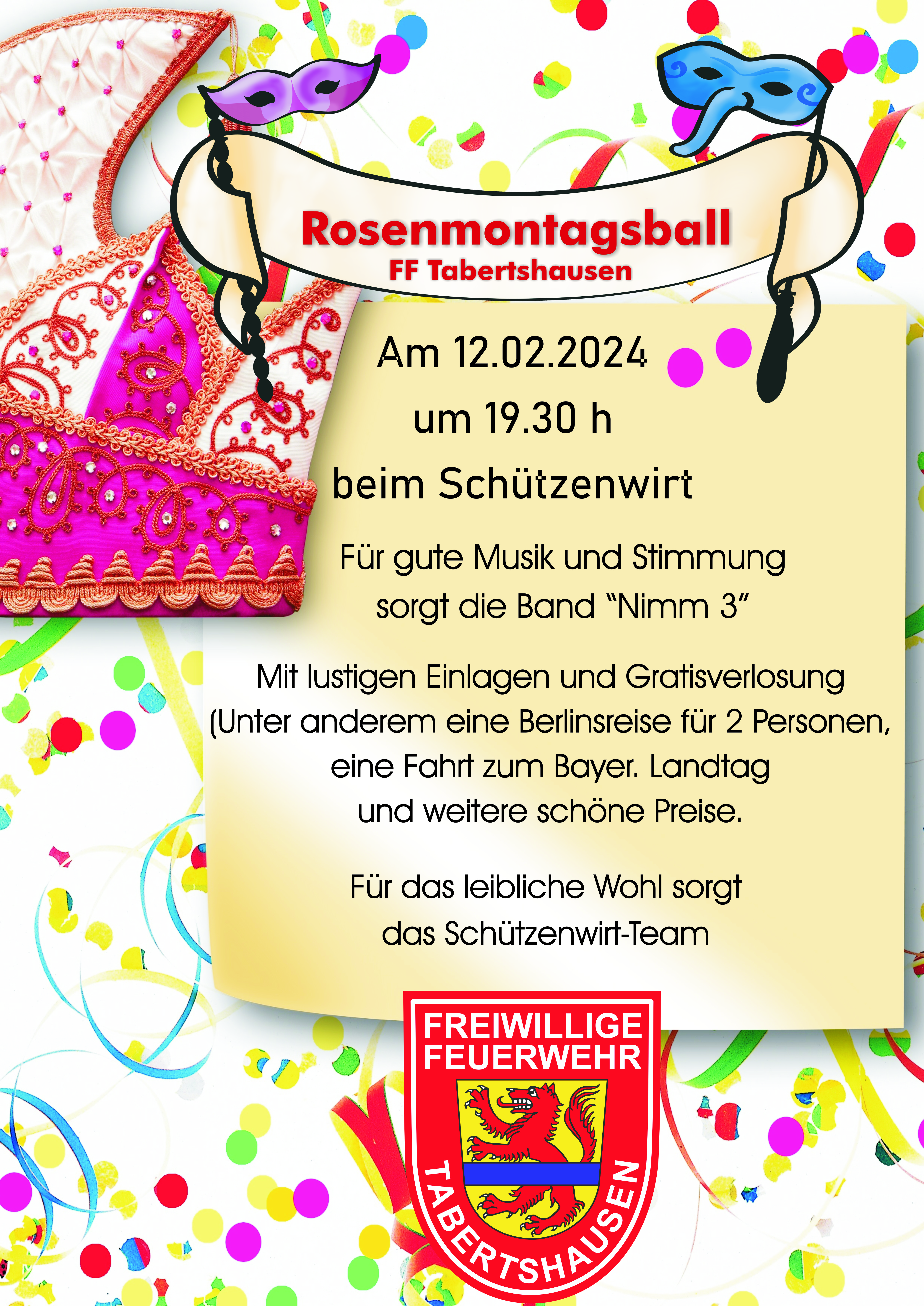 Die Feuerwehr Tabertshausen lädt herzlich zu ihrem traditionellen Rosenmontagsball ein. Zum Tanz spielt die Band "Nimm 3" auf. Es gibt wieder eine Tombola und lustige Einlagen. Für das leibliche Wohl sorgt unser Schützenwirt