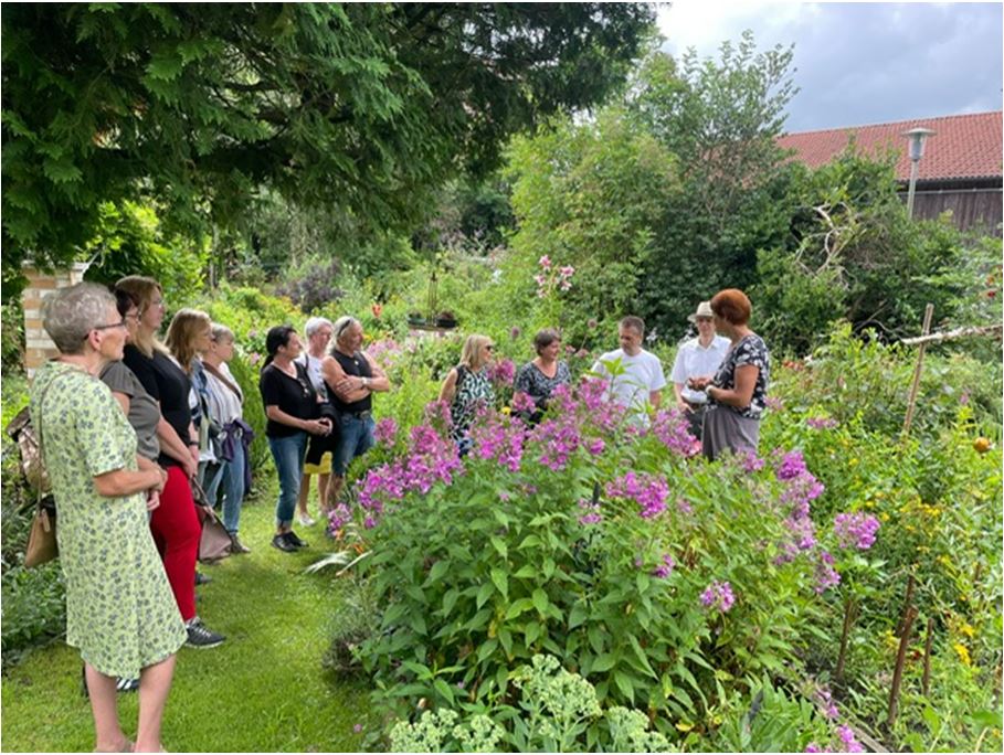 Die Gartenanlage von Siglinde Eder ist über die Landkreisgrenzen hinaus bekannt. Seit 2007 ist die gelernte Gärtnerin als Kräuterpädagogin tätig. Sie bietet neben Wanderungen und diversen Kursen auch Führungen im eigenen Garten an. Hier dürfen Kräuter und „Unkräuter“ oft auch zusammen mit Gemüse und Blumen in den Beeten wachsen, wobei sich die Kräuter von der momentanen Schneckenplage weit weniger beeindruckt zeigten, als die Blumen und das Gemüse. Dieses Phänomen kannten die teilnehmenden Gartler auch vom eigenen Garten zur Genüge.