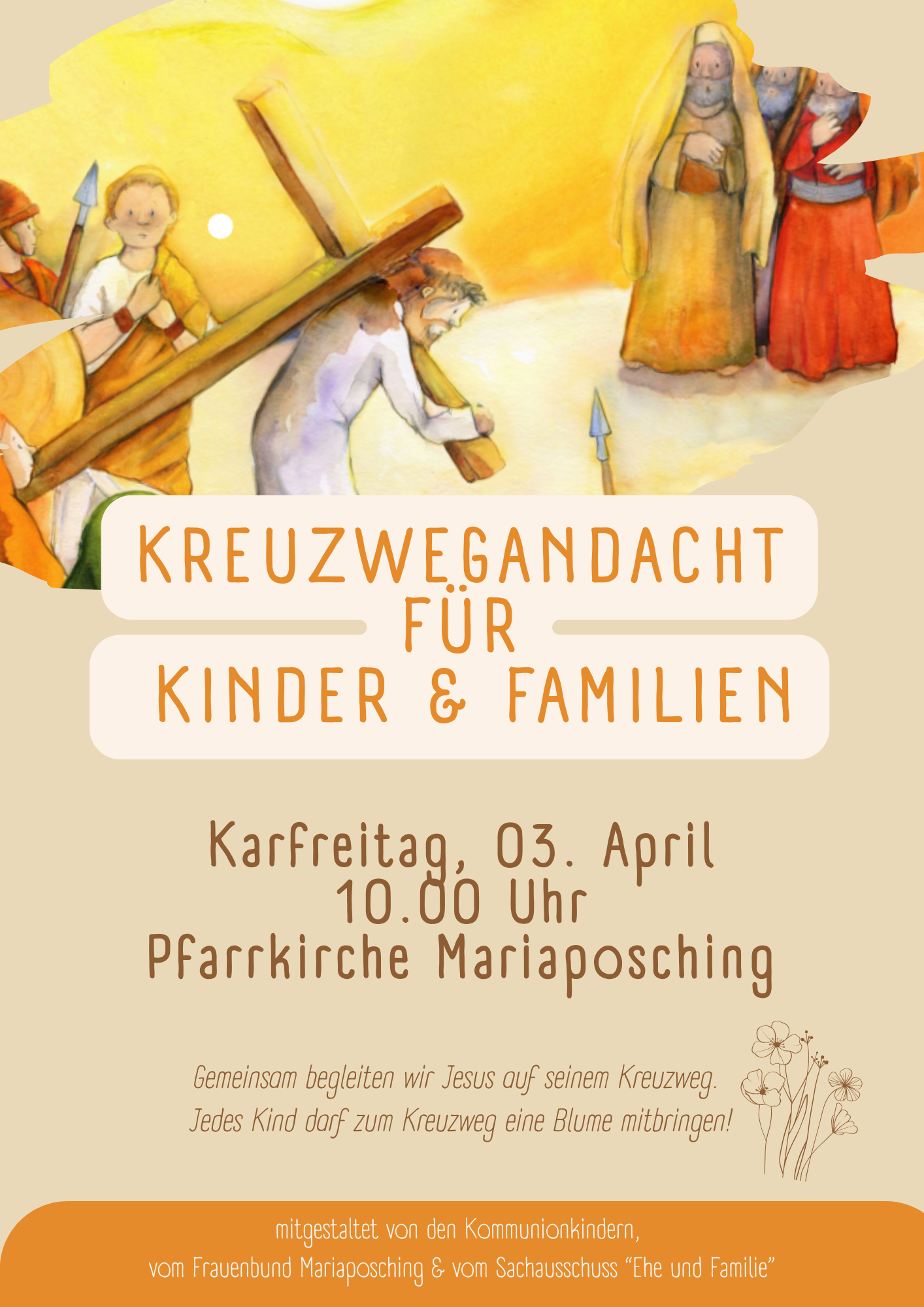 Herzliche Einladung an alle Kinder & Familien zur Kreuzwegandacht am Karfreitag, 03. April um 10.00 Uhr in der Pfarrkirche Mariaposching. Der Kreuzweg wird mitgestaltet von den diesjährigen Kommunionkindern, dem Frauenbund Mariaposching & dem Sachausschuss „Ehe und Familie“. Zur Andacht darf jedes Kind eine Blume mitbringen.