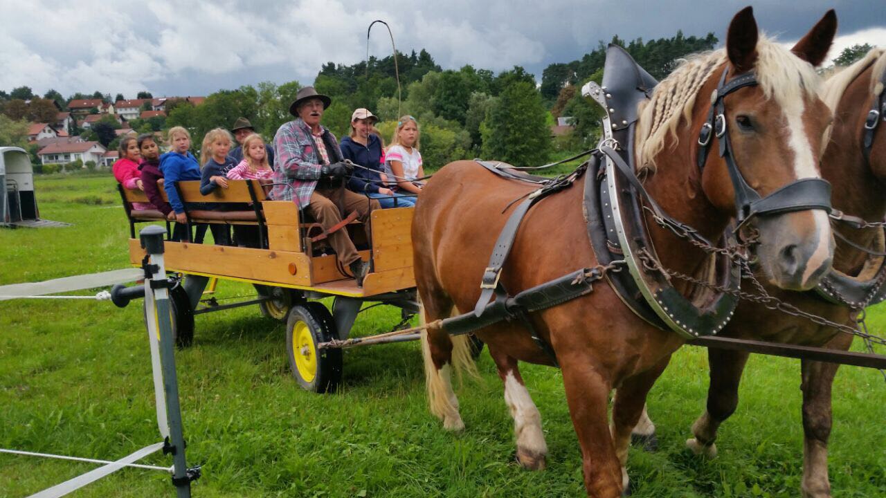 Am Samstag den 19.August fand auf unserer Vereinsanlage,das jährliche Ferienprogramm statt. Es nahmen 30 Kinder im Alter von 5-10 Jahren teil. Wir fuhren mit der Kutsche, in der Max seine zwei Kaltblüter eingespannt hatte, zum Eisessen, malten tolle Pferdebilder. Unter fachlicher Anleitung fürhten und ritten wir die Pferde.