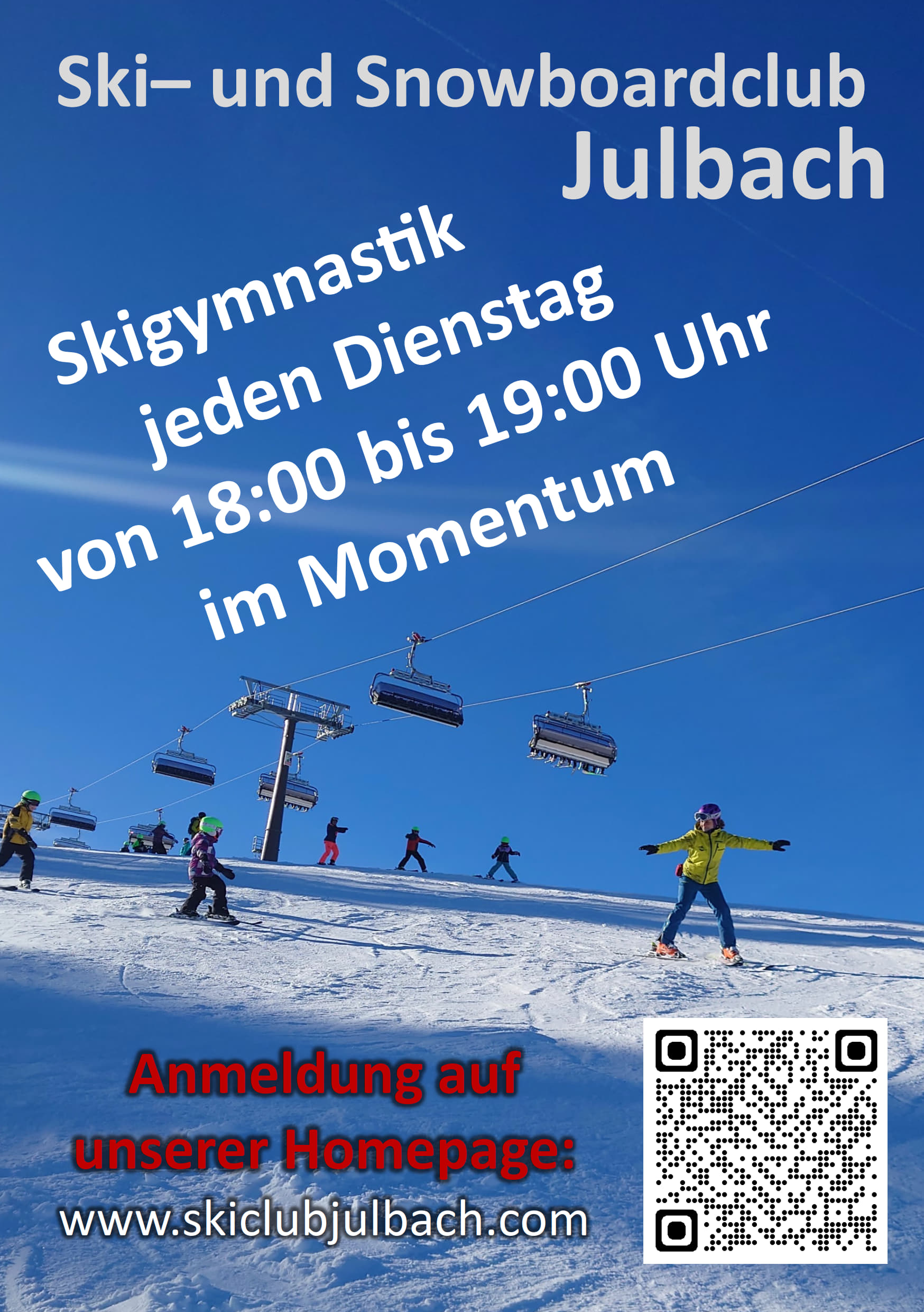 Aufgrund der begrenzten Teilnhemerzahl ist eine Anmeldung auf unserer Homepage unter www.skiclubjulbach.com nötig.