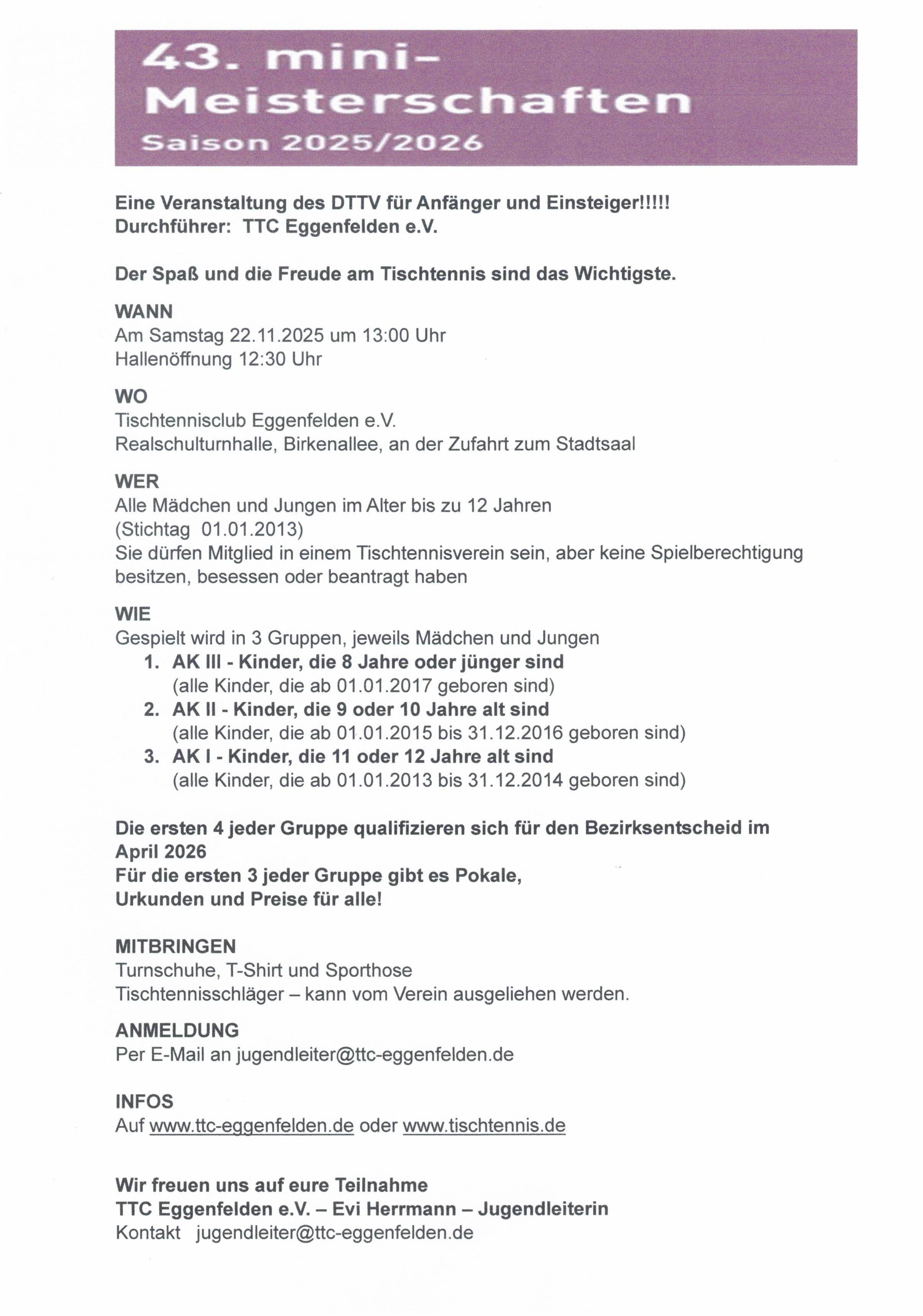Anmeldung und Infos bis 20.11.2025 unter: jugendleiter [at] ttc-eggenfelden oder WhatsApp 0171 8435663